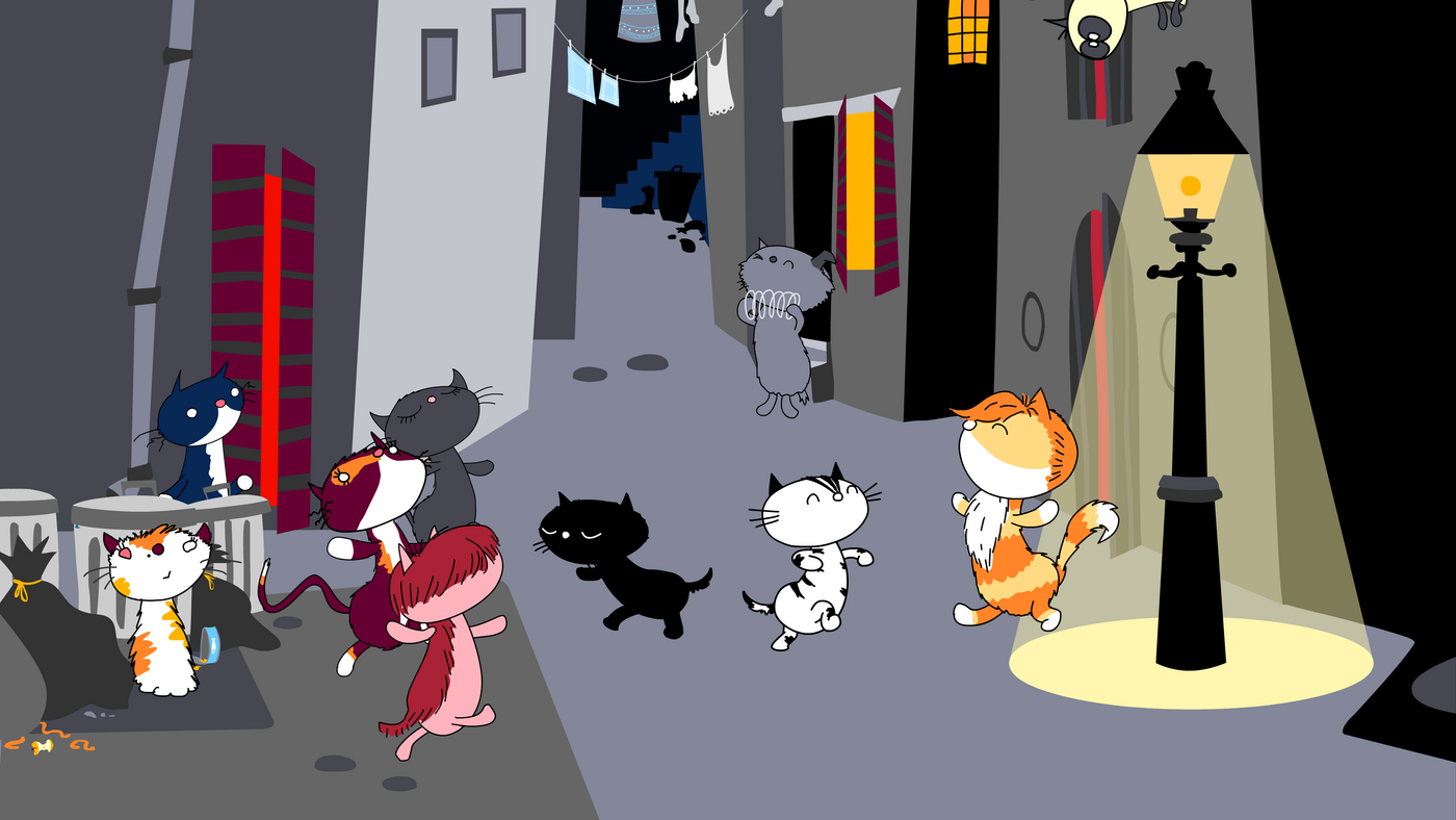 De twee katten Pim en Pom zijn elkaars beste vrienden en wonen samen bij hun baasje de Vrouw. Als de nichtjes Treesje en Sjaantje op bezoek komen, nemen ze de poezen mee naar het park voor een picknick. Zij willen dolgraag de katten zelf houden en bedenken daarvoor stiekem een plan. Als Pim en Pom weten te ontsnappen aan de nichtjes, verdwalen ze en moeten samen op straat overleven. Daar ontmoeten ze een straatkattenbende die hun vriendschap op de proef stelt. Gaat het Pim en Pom lukken om samen te blijven en hun baasje terug te vinden?