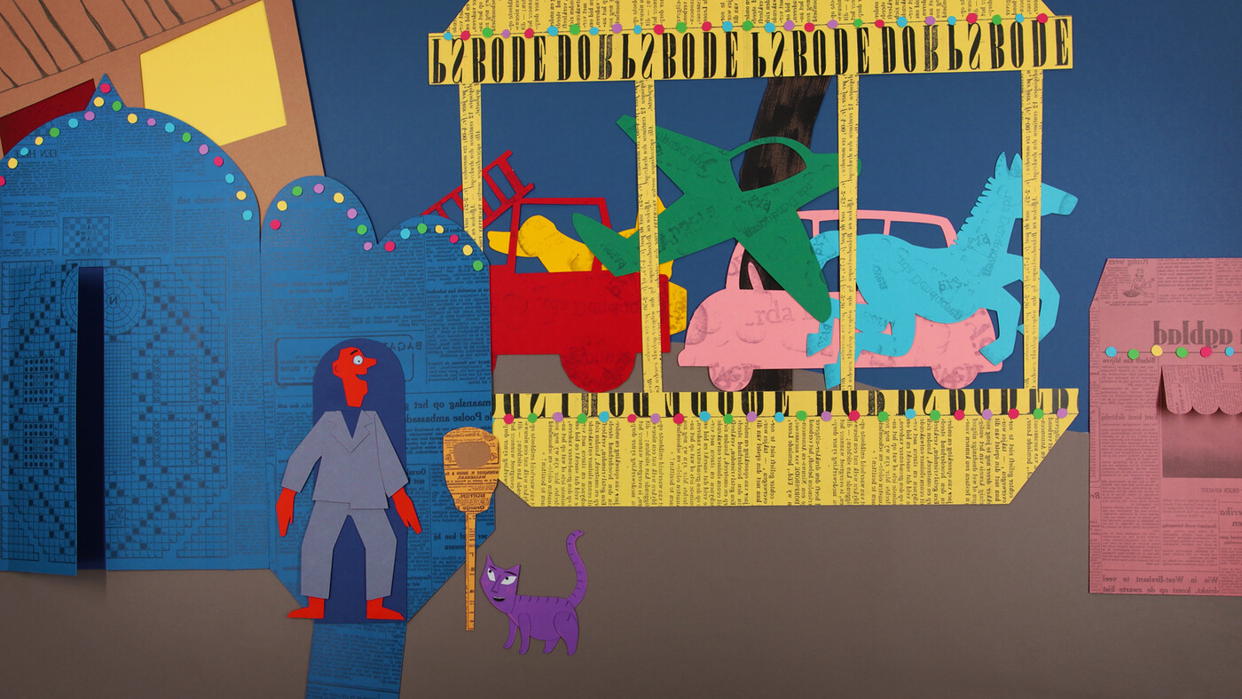 Meneer Papier knipt een kermis met een draaimolen en lachspiegels. Maar tussen al die spiegels raakt hij plots helemaal de weg kwijt.
